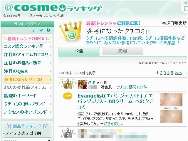 7月7日からだったかな、アットコスメさんで『参考になったクチコミランキング』っていうコーナーができたみたいなんだけど。