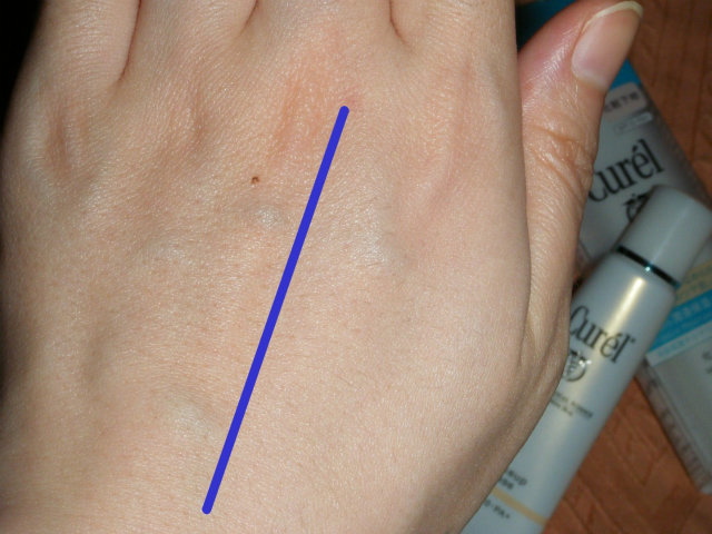青線の左側が何も塗っていない状態、右側がキュレルの下地を塗った状態です。