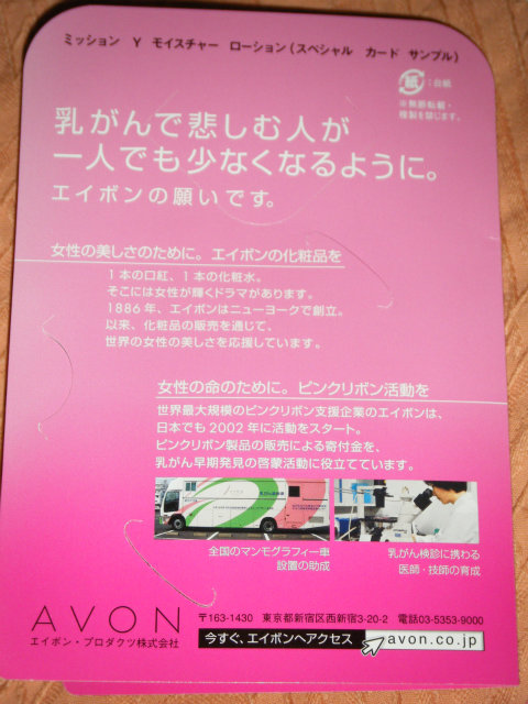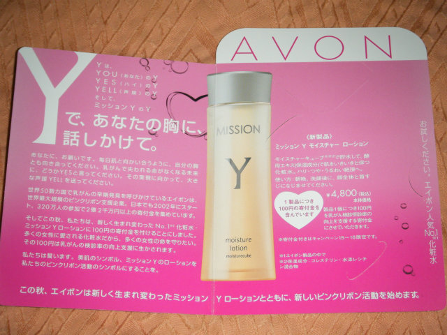 エイボンは2002年にピンクリボン活動に参加しており、世界最大規模のピンクリボン支援企業ですが、今回のミッションYモイスチャーローションには100円の寄付金をつけることにしたそうです。