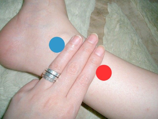 くるぶしから指3本分の赤丸印のあたりが ツボだそうです。