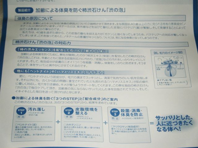 でも、柿渋石けんに配合された「柿渋エキス」は、単に消臭するだけじゃなく、体臭の原因となる皮脂などの老廃物を綺麗に落としながら、殺菌&消毒&消臭をしてくれるというスグレモノなんですって。