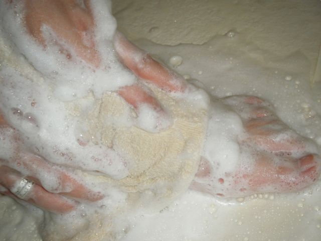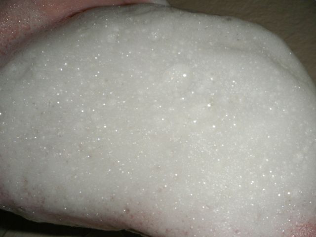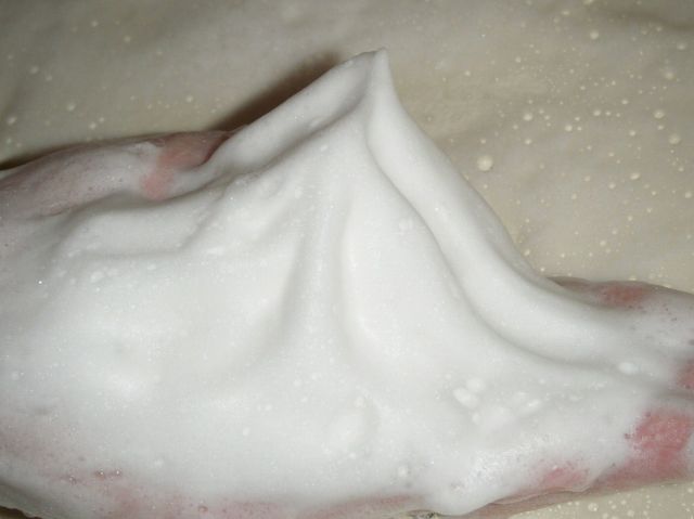 すぐに消えてなくなるような頼りない泡ではないけれど、空気と水分をよく含ませるとこういうふわふわ泡になります。