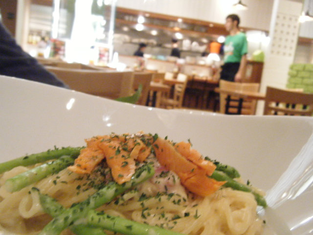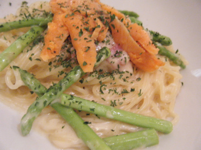 でも今回のサーモンとアスパラのクリームソースには、確かにこっちの麺のほうが合ってるんだろうなって思った。