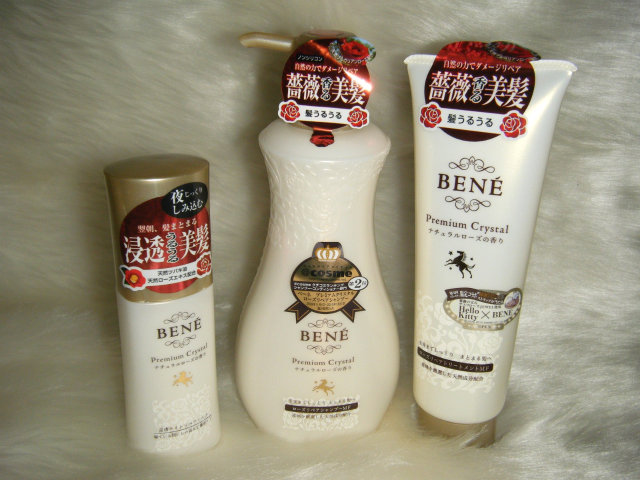 ベーネプレミアムクリスタルさんの『ローズリペアシャンプーMF』、『ローズリペアトリートメントMF』、『浸透ナイトリペアミルク』を使ってみました。